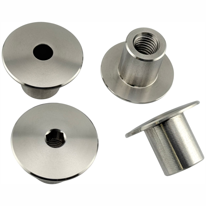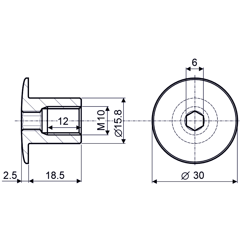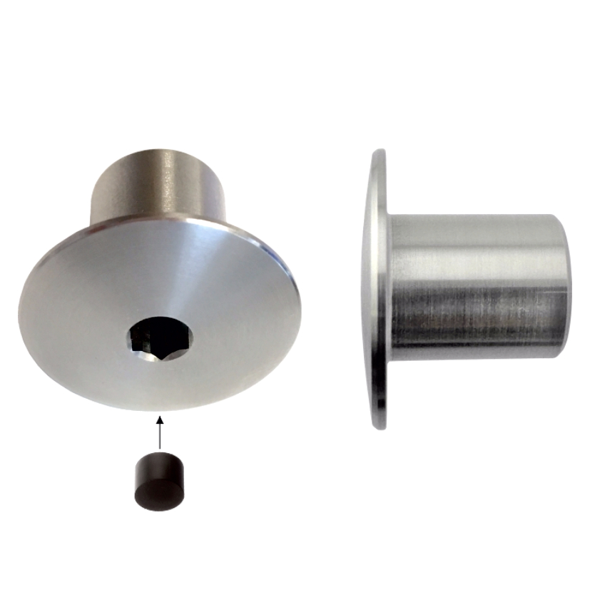 LamiFIX® Rundmutter M10 aus Edelstahl A2 (Ø 30 mm) mit 6 mm Innensechskant und passendem Verschluss-Stopfen. Sauber feingedreht, einzeln verpackt zum Schutz der Oberfläche. Ideal für hochwertigen Innenausbau.